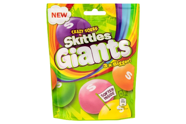SKITTLES Giants sind 3x größer als die originalen SKITTLES mit der gleichen knusprigen Schale und dem größeren weichen Kern mit einer Explosion von sauren, fruchtigen Aromen. Die SKITTLES Giants Sours Packung enthält die Geschmacksrichtungen Ananas, Himbeere, Kirsche, Mandarine und saurer Apfel. SKITTLES werden groß verkauft!
